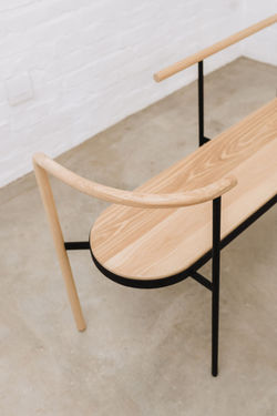 Epoxy coated steel frame with bent ash wood backrest & seat.The perfect conversation bench.